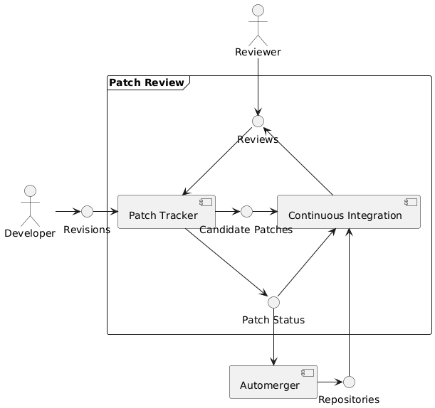 | persia | But that conflates two different nouns, to some degree. It's perfectly possible to have a system where "patch review" consumes from one system and outputs to another. I'm not sure I have two words for those two things. | 12:12 |